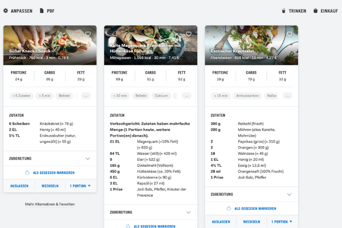 Auch die Struktur der Ernährungspläne hilft mir im Alltag sehr. Ich muss mir keine Gedanken darüber machen, was ich essen soll, und kann meine Mahlzeiten gezielt vorkochen. Dadurch ernähre ich mich bewusster und abwechslungsreicher, ohne jedes Lebensmittel manuell tracken zu müssen.