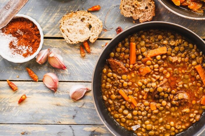 - Tomatenmark hinzugeben und gut vermischen. Dann mit der Brühe ablöschen, aufkochen und bei geringer Hitze 20 Minuten schmoren lassen.
