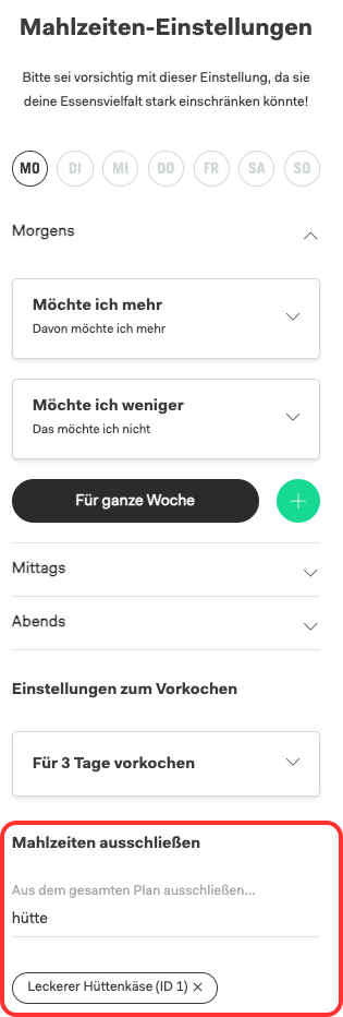 4. Scrolle nach unten zu „Mahlzeiten ausschließen“. Dort kannst du einzelne Rezepte oder Gerichte auswählen, die du nicht mehr in deinem Plan angezeigt bekommen möchtest.